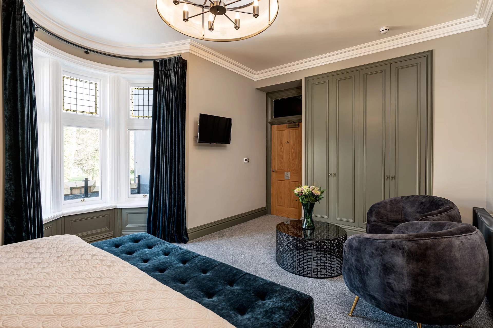 A spacious, elegantly appointed suite featuring a luxurious super king-size bed, and large windows with beautiful views. Enjoy premium amenities including a large flat-screen TV, complimentary high-speed Wi-Fi, a welcome basket, and an in-room espresso maker. The large upscale bathroom offers a gorgeous standalone soaking tub, separate walk-in shower room, plush bathrobes, and deluxe toiletries.
