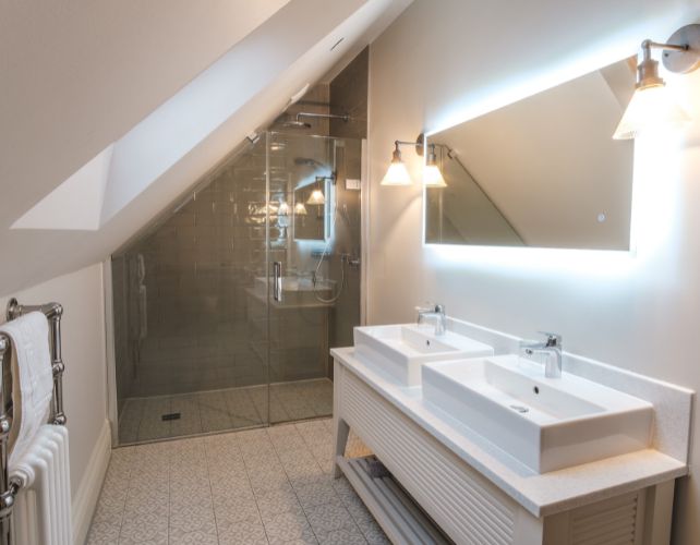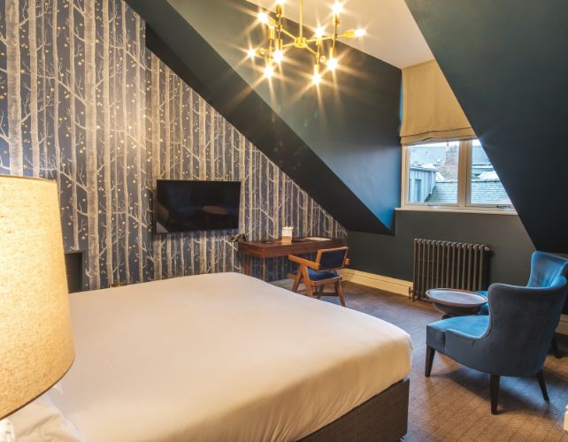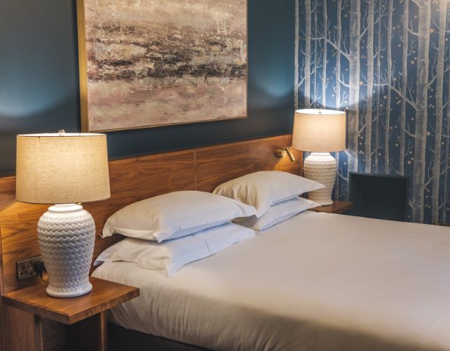 A modern, cozy guest room featuring a superking sized bed, soft ambient lighting, and contemporary decor. Enjoy convenient amentities including a flat-screen TV, complimentary Wi-Fi, a work desk and in-room tea & coffee facilities. The private bathroom offers a walk-in shower, premium toiletries and fresh towels.