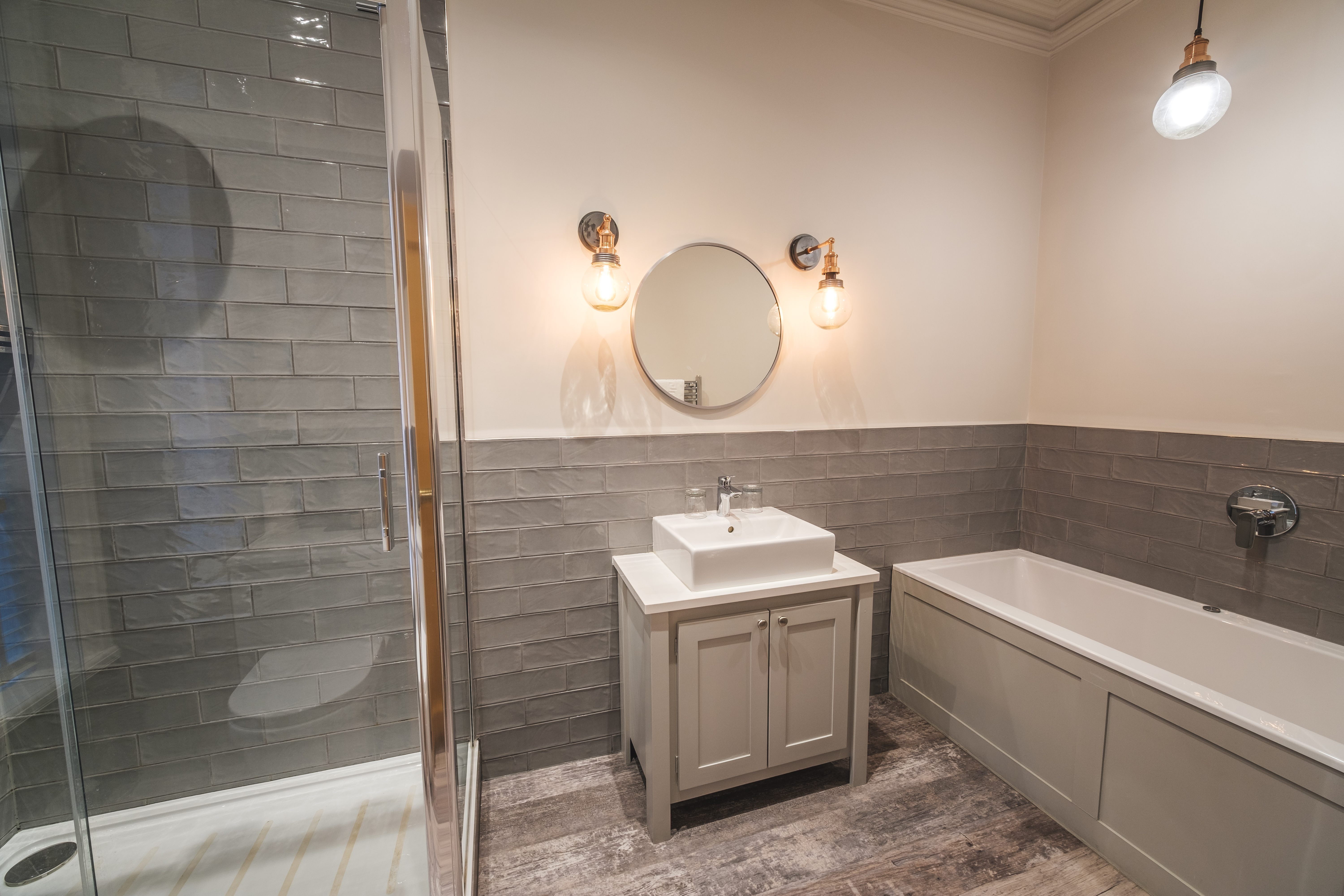 A modern, cozy guest room featuring a superking sized bed (available as twin beds on request), soft ambient lighting, and contemporary decor. Enjoy convenient amentities including a flat-screen TV, complimentary Wi-Fi, a work desk and in-room tea & coffee facilities. The private bathroom offers a bath and seperate shower, premium toiletries and fresh towels.