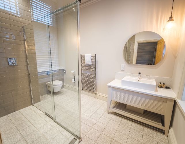 A modern, cozy guest room featuring a super king-sized bed (available as twin beds on request),  soft ambient lighting, and contemporary décor. Enjoy convenient amenities including a flat-screen TV, complimentary Wi-Fi, a work desk, and in-room tea & coffee facilities. The private bathroom offers a walk-in shower, premium toiletries, and fresh towels.